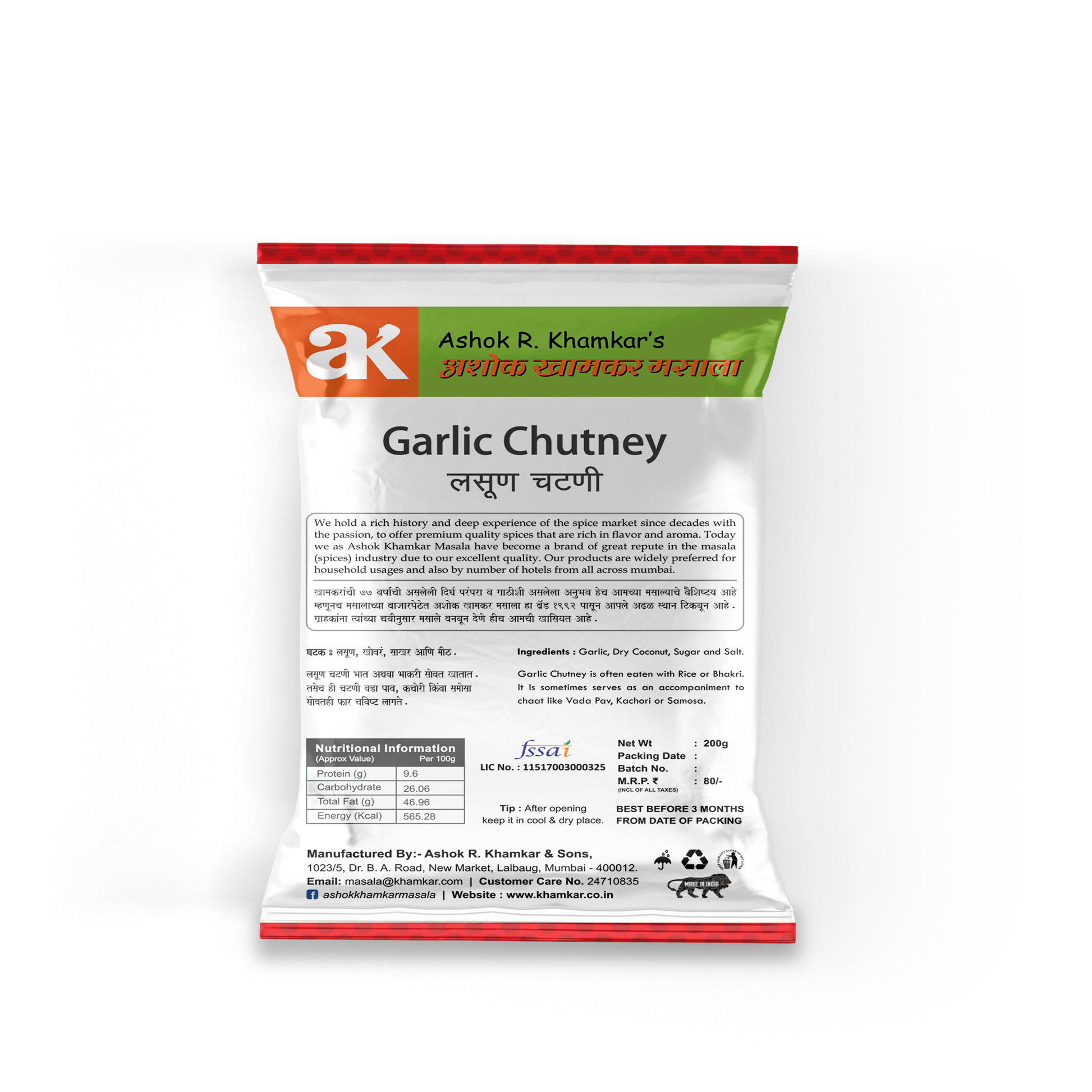 Infuse your meals with the bold and tangy taste of our Garlic Chutney. Made with authentic ingredients and a touch of nostalgia, this versatile chutney is a testament to our family's culinary journey. With the perfect balance of spices and the robust flavor of fresh garlic, our chutney pairs wonderfully with a variety of dishes, adding a burst of excitement to your culinary creations. Experience the tradition and warmth of Ashok Khamkar Masala's Garlic Chutney, and elevate your meals with an explosion of flavors!