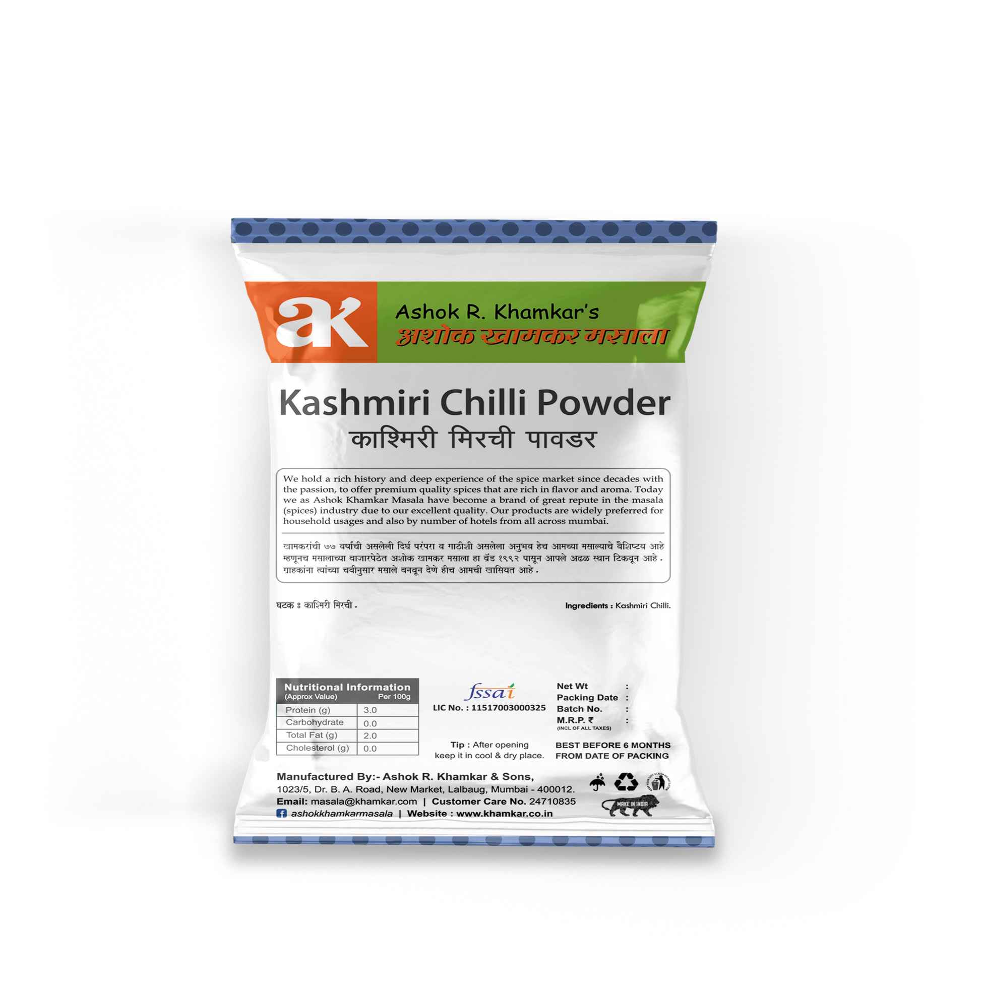 For those who believe that a touch of red makes all the difference, our 500g pack of Kashmiri Chili Powder is a treasure trove of vibrant flavors. From rich curries to fiery marinades, this premium spice adds a luscious hue and mild heat to your culinary creations. Crafted with the utmost care and precision, our Kashmiri Chili Powder encapsulates the rich heritage of Ashok Khamkar Masala, taking your dishes on a journey of traditional tastes and authentic flavors.