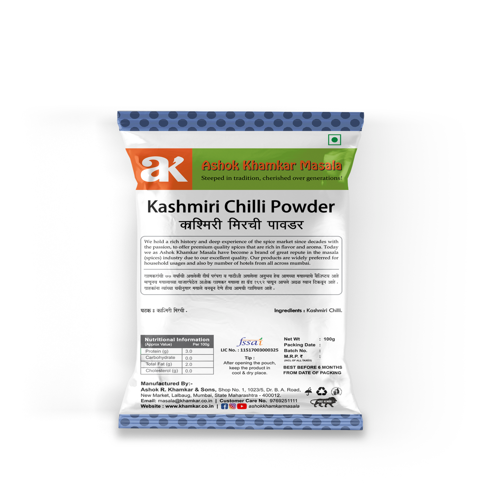 Embrace the heat and striking color of Ashok Khamkar Masala's Kashmiri Chili Powder. Perfect for those who prefer a gentle kick, this exquisite spice carries the legacy of our family's passion for quality and flavor. Our Kashmiri Chili Powder is a versatile addition to your kitchen, allowing you to create tantalizing dishes with an authentic Indian touch. Be it lip-smacking curries or spicy snacks, let our premium spice blend add a touch of tradition and warmth to your culinary endeavors!